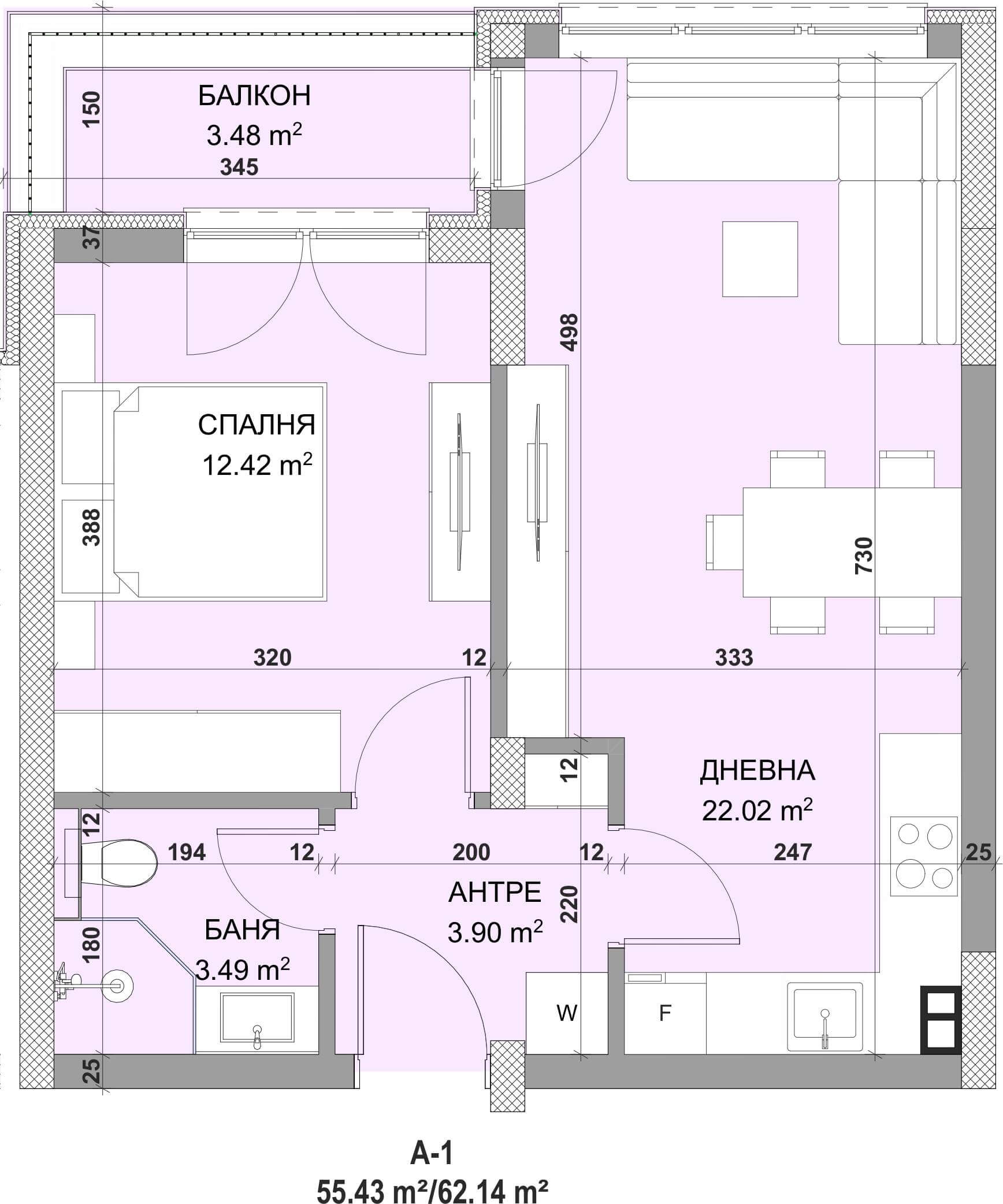 Апартамент – дневна с кухненски бокс, спалня, баня с тоалетна, антре, балкон