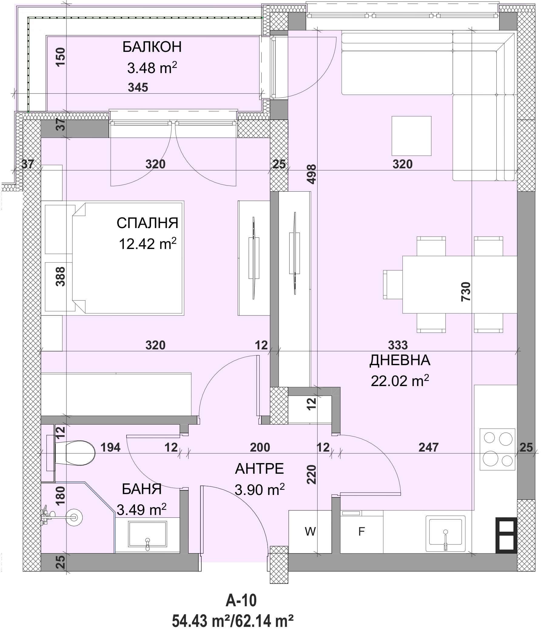 Апартамент – дневна с кухненски бокс, спалня, баня с тоалетна, антре, балкон