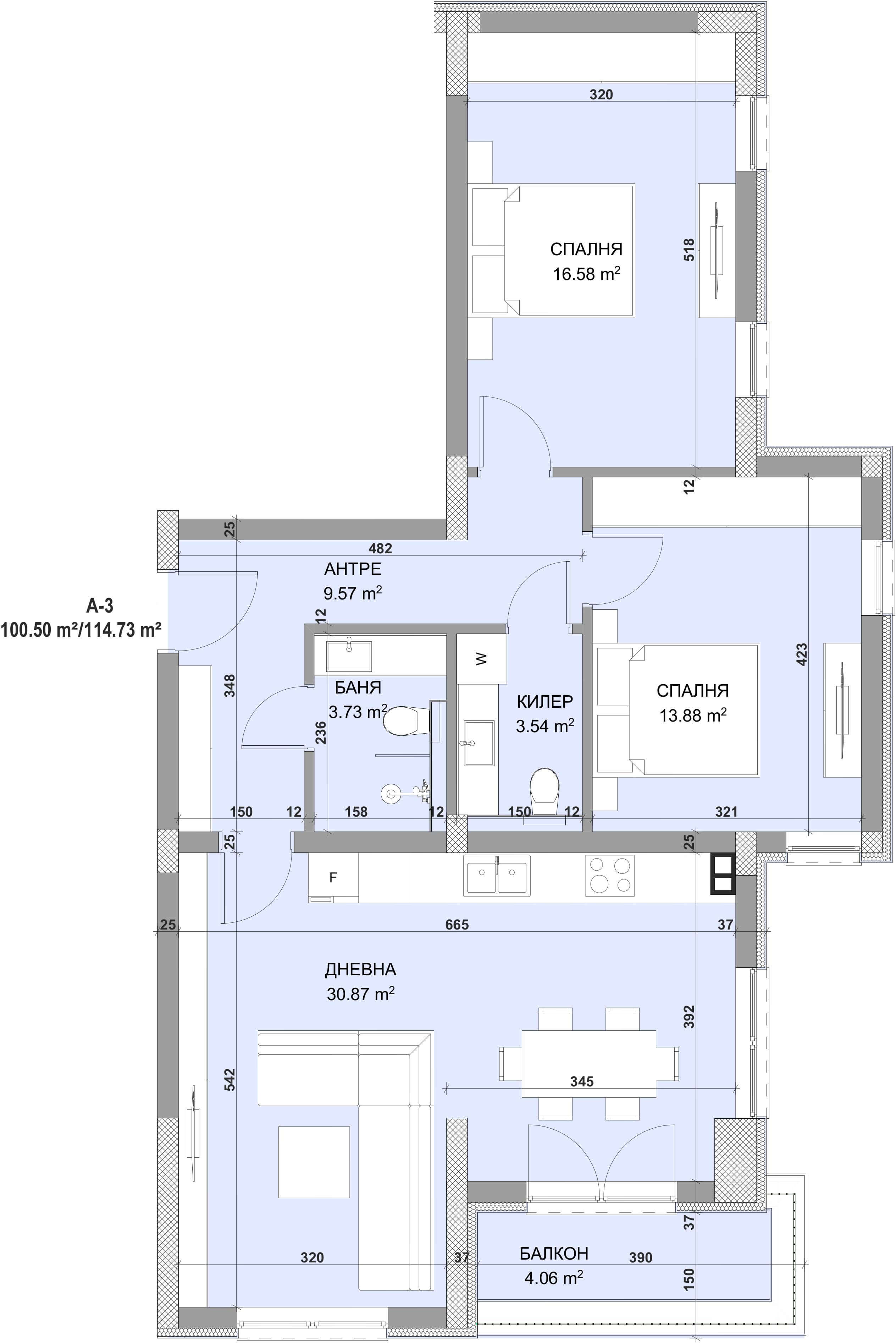 Апартамент – дневна с кухненски бокс, 2 спални, баня с тоалетна, килер, антре, балкон