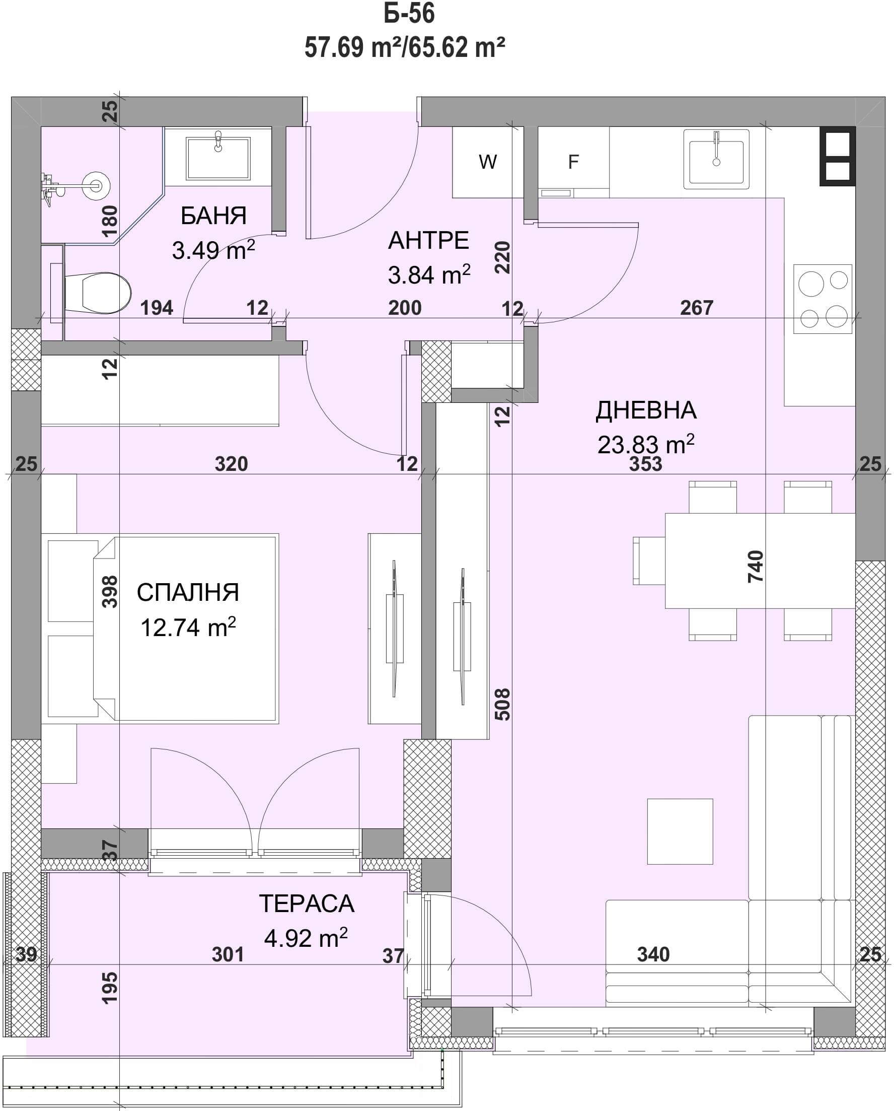 Апартамент – дневна с кухненски бокс, спалня, баня с тоалетна, антре, тераса