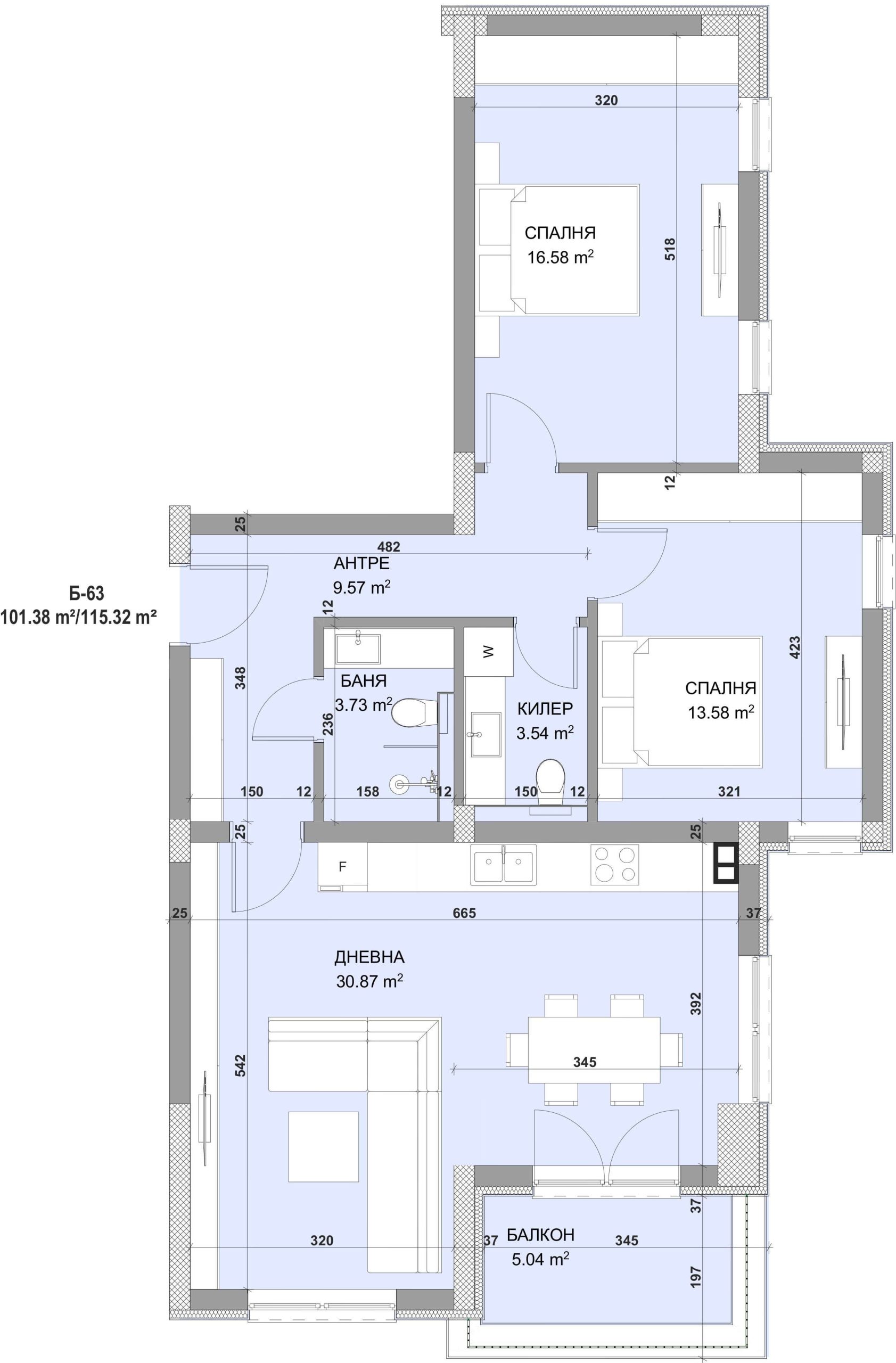 Апартамент – дневна с кухненски бокс, 2 спални, баня с тоалетна, килер, антре, балкон