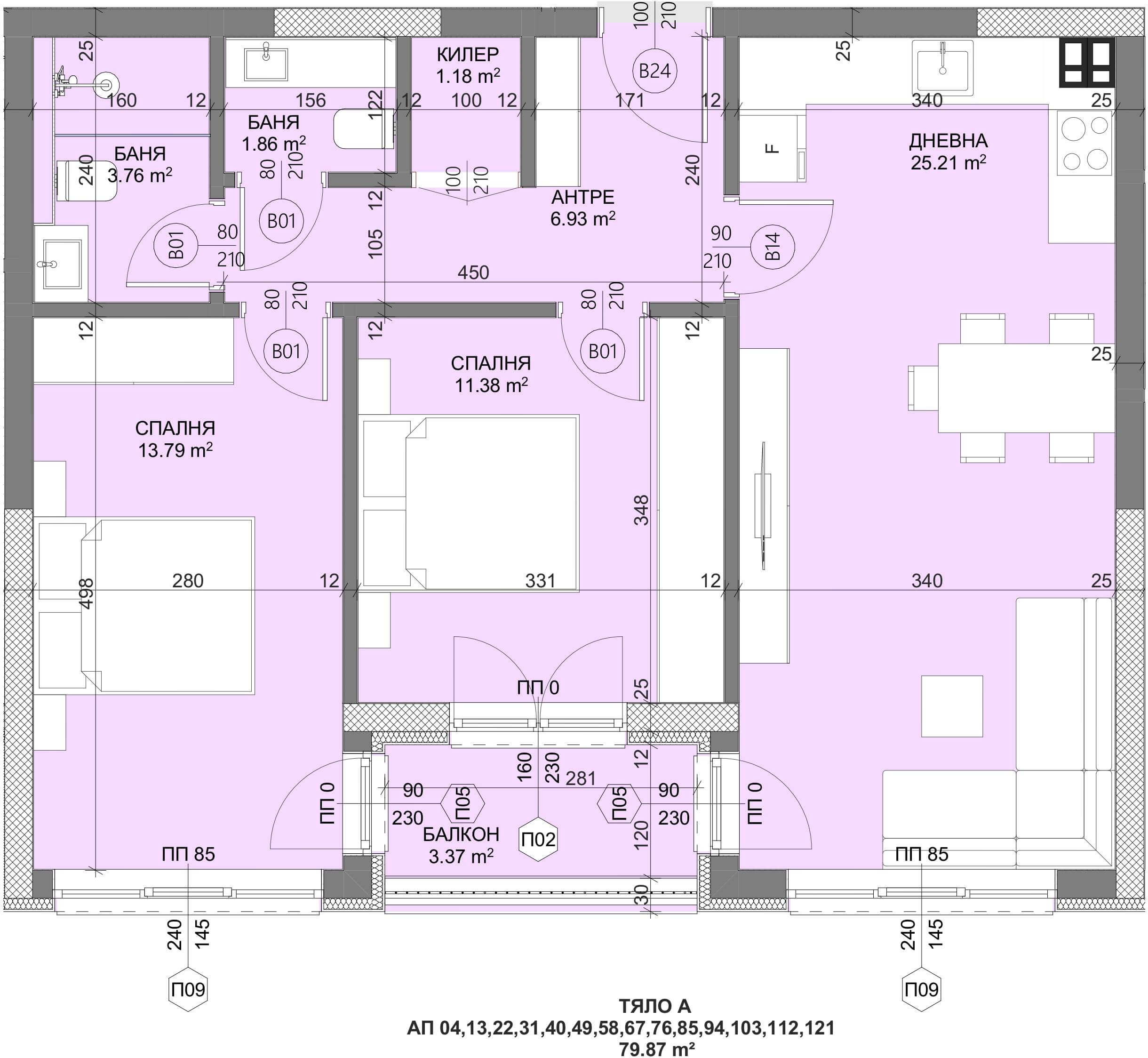 Апартамент – Дневна с кухненски бокс, 2 спални, баня с тоалетна, тоалетна, килер, антре и балкон.